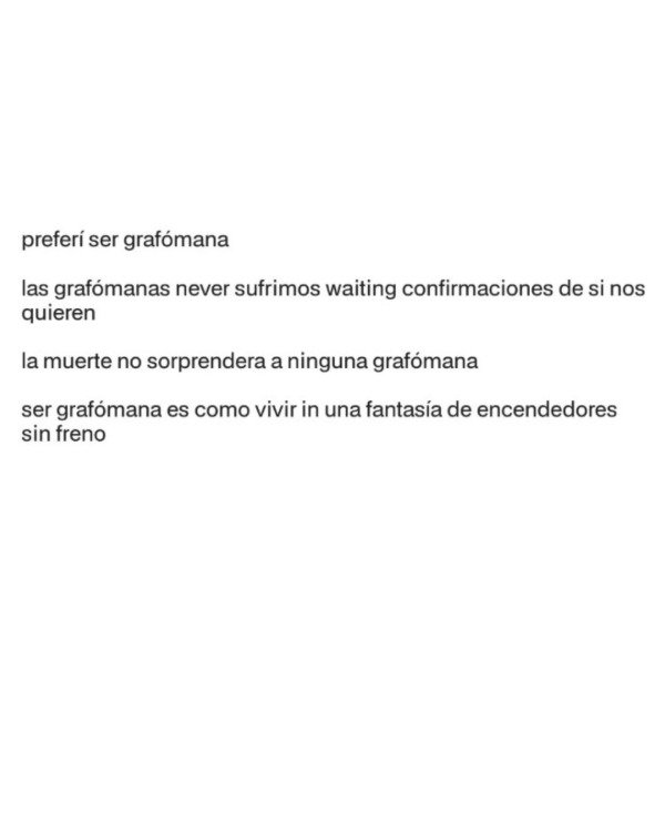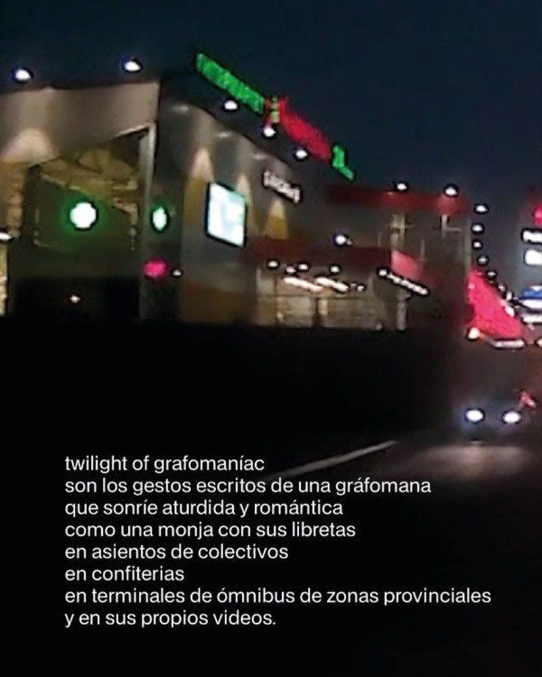 Son los gestos escritos de una grafómana que sonríe, aturdida y romántica, como una monja con sus libretas en asientos de colectivo, en confiterías, en terminales de ómnibus de zonas provinciales y en sus videos.